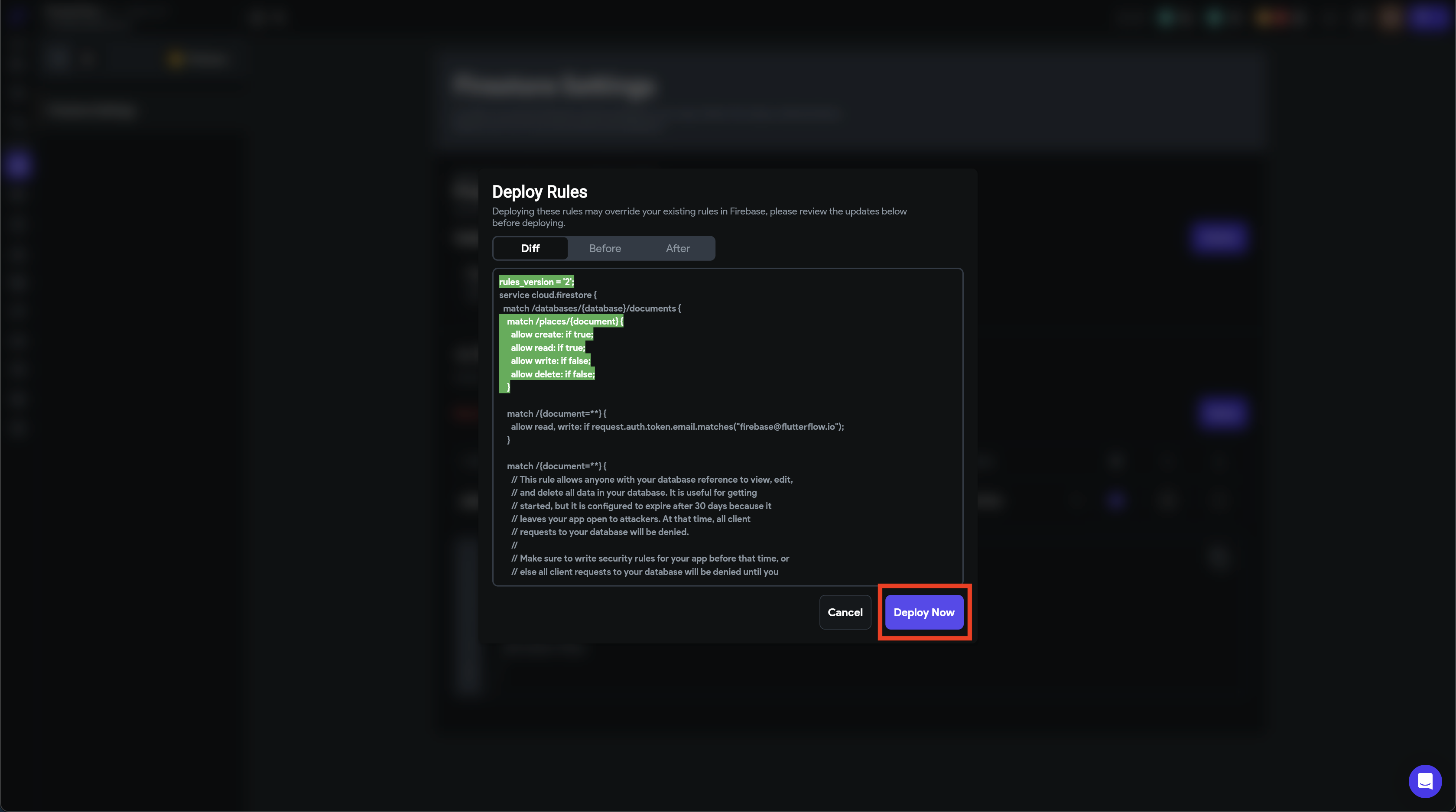 Firestore RulesのDeployボタンを押して、Rulesをデプロイしてください。