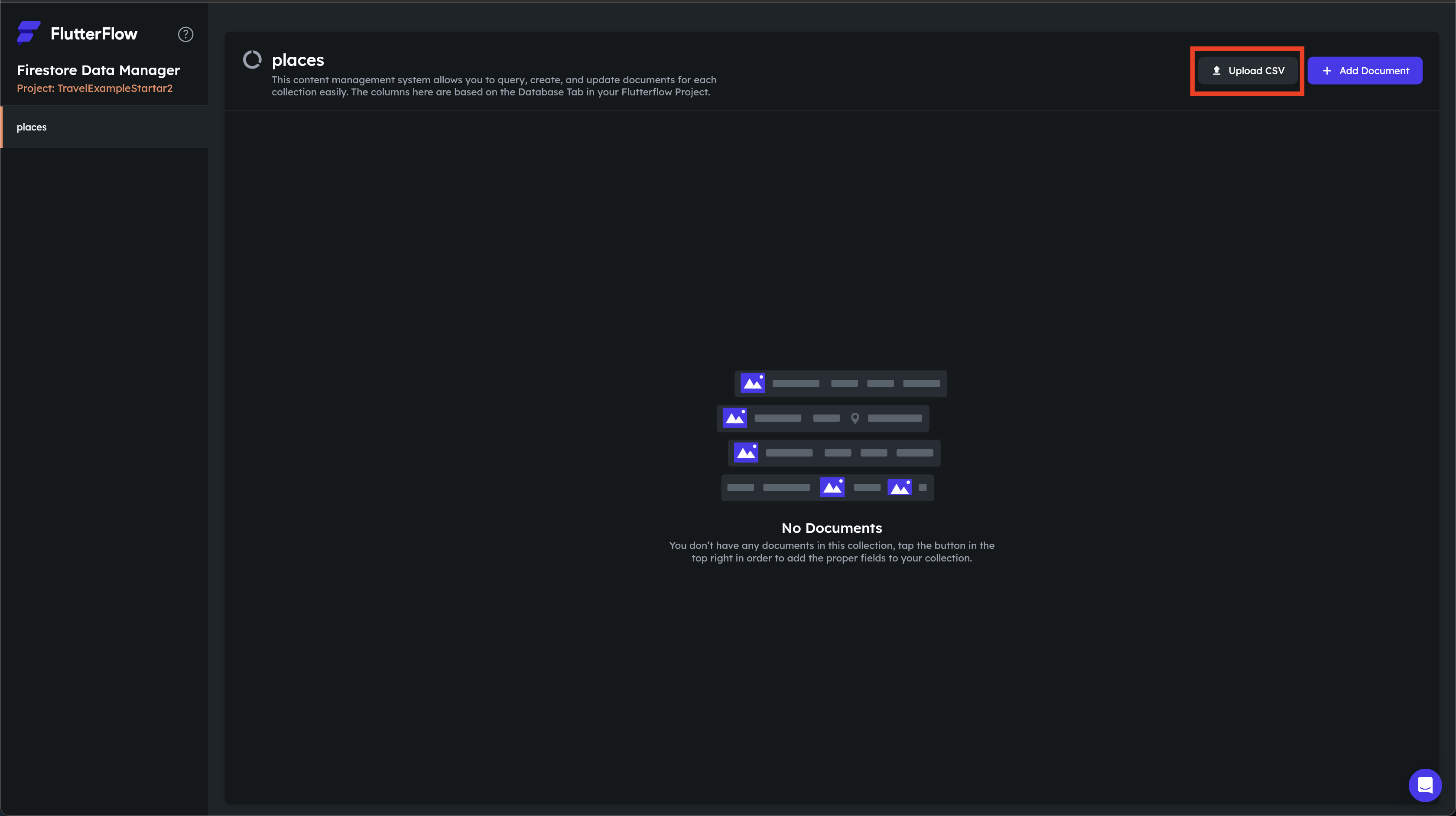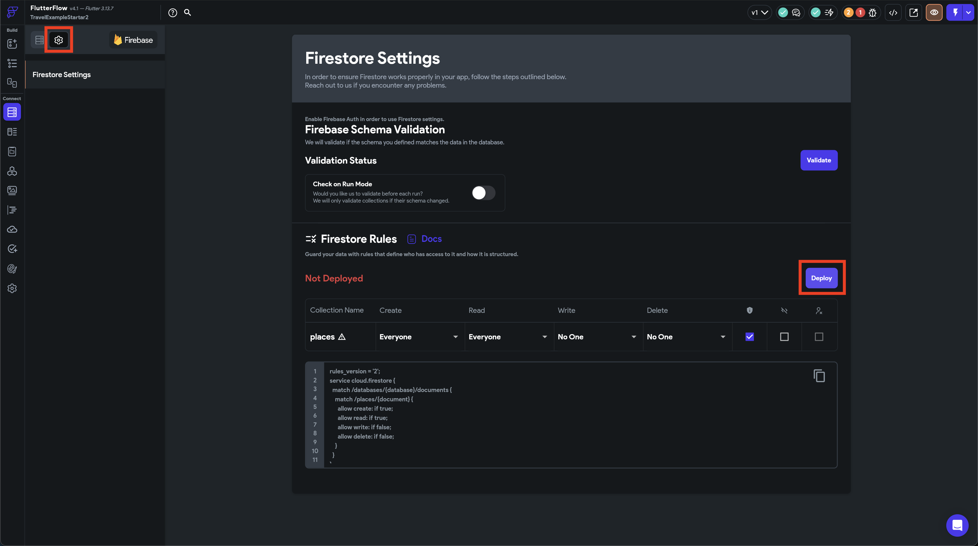 次にFlutterFlowのプロジェクト画面に戻り、Firestore Settingsタブを選択します。